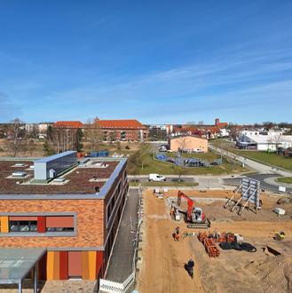 Auch an den Außenanlagen sowie der verkehrlichen Anbindung wird nach der witterungsbedingten Pause über die Wintermonate, wieder gearbeitet. Nach Abschluss dieser Arbeiten werden die Schülerinnen und Schüler, aber auch die Lehrkräfte in einem zeitgemäß, attraktivem Umfeld dem schulischen Alltag nachgehen können. Der gesamte Bereich hinter dem städtischen Haus der Jugend wird sein Aussehen verändern. Dort wo jetzt Straßen und Gehwege enden, wird sich im weiteren Verlauf das neue Wohngebiet „Regimentsvorstadt“ anschließen, dessen Erschließung aktuell ebenfalls läuft.