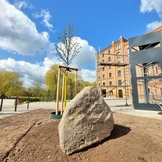 Der restaurierte Gedenkstein und die Einheitslinde bilden das bekannte Ensemble an neuem Standort vor der Parchimer Kulturmühle.