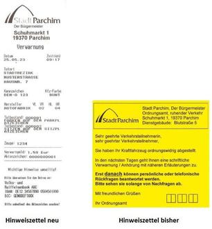 Wer in der Kreisstadt falsch parkt oder keinen Parkschein gelöst hat kennt sie, die gelben Zettel mit dem Hinweis auf die begangene Ordnungswidrigkeit. Ab der 33. Kalenderwoche bekommen diese Hinweiszettel eine neue Farbe. Die bisherigen gelben Abschnitte werden durch eine Art Kassenbon ersetzt. Die Außendienstmitarbeiter haben dafür ab sofort mobile Drucker dabei, mit denen die Belege direkt ausgedruckt werden. Diese listen Informationen über die begangene Ordnungswidrigkeit auf und beinhalten die Bankverbindung der Stadt Parchim. Der Bürger hat somit die Möglichkeit das Verwarngeld innerhalb einer Woche direkt zu bezahlen. Eine Anhörung per Brief erfolgt bei Zahlung nicht mehr. Zu diesem Zeitpunkt ist das Verfahren für den Bürger noch nicht online einsehbar.