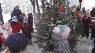 Sogar das Wetter spielte mit an diesem Mittwoch, dem 29. November. Reichlicher Schneefall in der Nacht zuvor hatte die Wiese in eine winterliche Traumlandschaft verwandelt, so dass einige von den 38 Kindern, vor allem die größeren, gar nicht anders konnten und – sehr zur Freude der Erwachsenen – erst einmal eine Runde durch den frischen Schnee laufen mussten. Doch dann riefen auch schon die Erzieherinnen und teilten den Baumschmuck aus. Voller Eifer hingen die Kleinen ihre selbst gebastelten Figuren und Sterne, aber auch einige Kugeln an den Baum. Auf unsere Fragen, was sie sich zu Weihnachten wünschen, erzählten sie lebhaft.