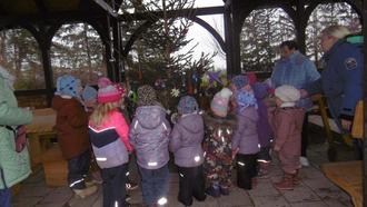 Erwartungsvolle Gesichter, Kinder neugierig auf das, was kommt und dann beim Verzieren des Baumes ganz bei der Sache. Ruckzuck wird ein Platz auf den Bänken gesucht, der Kekskarton rumgereicht und warmer Tee eingeschenkt. Ein großes Lob kommt von Paul, denn der Tee ist seiner Meinung nach „richtig gut“. Fröhliche Kindergesichter, der Baum wird noch einmal bestaunt und schon ist es Zeit, den Rückweg anzutreten. Zum Abschied singen alle zusammen ein paar Weihnachtslieder. Auf Wiedersehen, ein schönes Weihnachtsfest und bis zum nächsten Mal!