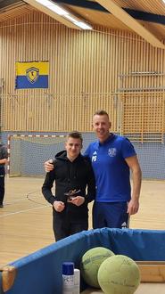 Patrick Stech übergibt Frederic Zacharias den Pokal für seine Leistung als "Bester Torwart" im A-Jugend-Turnier.