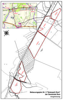 Die Gemeindevertretung der Gemeinde Rom hat mit Beschluss vom 01.03.2023 den Planentwurf des Bebauungsplans Nr. 3 „Solarpark Rom“ in der Fassung vom Januar 2023 beschlossen und zur öffentlichen Auslegung bestimmt.