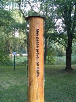 Unser Friedenspfahl trägt die Aufschrift in 5 Sprachen- in Deutsch, Englisch, Russisch, Arabisch und Japanisch.