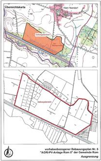 Zur Beteiligung der Öffentlichkeit gemäß § 3 Abs. 2 BauGB wird der Entwurf des vorhabenbezogenen Bebauungsplan Nr. 5 der Gemeinde Rom „AGRI-PV-Anlage Rom II“, bestehend aus der Planzeichnung (Teil A), dem Text (Teil B), der Begründung und des Umweltberichts in der Fassung vom Mai 2025, einschließlich der nachfolgend genannten, umweltbezogenen Informationen