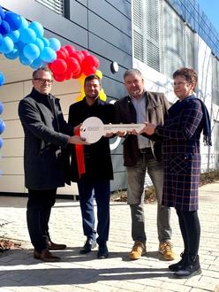 Schulleiterin Hanka Becker nimmt den symbolischen Schlüssel von Goldbeck-Geschäftsführer Volker Huber, Landrat Sebastian Constien und Kreistagspräsident Veikko Hackendahl (v.l.) entgegen.