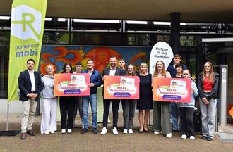 Gaben am 11. Juli den Startschuss für das KRASS-Deutschland-Ticket im Landkreis Rostock - VVW-Geschäftsführer Stefan Wiedmer (v. li.), Landrat Sebastian Constien, rebus-Geschäftsführer Thomas Nienkerk und Schulleiterin Birgit Hacker mit Schülerinnen und Schülern des Friderico-Francisceum-Gymnasiums in Bad Doberan.