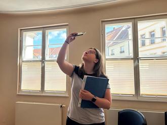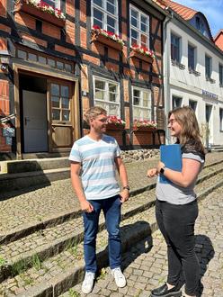 Heute geht es von Cammin weiter in die Blumenstadt Tessin. Denn dort bereitet das Trauzimmer im alten Mühlenhaus Sorgen. Die Stuckdecke, die erst vor wenigen Jahren saniert wurde, zeigt einen deutlichen Riss. „Das ist wirklich beeindruckend. Es scheint, als würde die Decke durchhängen“, sagt Lara Templin und macht Fotos mit dem Handy. Im Amt wird sie die Bilder einem Statiker zeigen und seinen Rat einholen. „Er wird sich das sicher auch noch einmal vor Ort anschauen müssen.“ Vorerst bleibt das Trauzimmer für Heiratswillige geschlossen. „Bis wir sicher sein können, dass es unbedenklich ist.“ Der Denkmalschutzbehörde geht es um den Erhalt und die Pflege schützenswerter Gebäude. „Aber wir wollen einer Nutzung nicht im Wege stehen. Wenn es beispielsweise um den Brandschutz geht, dann finden wir auch Kompromisse“, sagt Stephan Hagemann. An seiner Arbeit schätzt er besonders, dass er mit vielen unterschiedlichen Persönlichkeiten zu tun hat. „Vom Gutsherren, der sein großes Anwesen bewirtschaftet, bis zum Liebhaber, der sich jede Investition in sein Denkmal vom Munde absparen muss. Alte Gebäude sind für die Besitzer sicherlich eine Herausforderung, sie haben aber auch einen besonderen Charme.“ Von Tessin geht es für Stephan Hagemann und Lara Templin noch zu einem Termin bei einem Denkmal in Privatbesitz. Der Eigentümer möchte die Gauben im Dach sanieren und hat dazu Fragen. „Das schauen wir uns an und werden ihn beraten“, sagt Lara Templin und steigt auch schon wieder in den Dienstwagen.