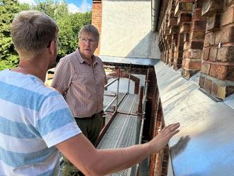 Darum will die Gemeinde, die Eigentümer des Gebäudes ist, Abhilfe schaffen. Bleche sollen künftig das zu flach gebaute Gesims schützen. „Weil es sich um ein denkmalgeschütztes Gebäude handelt, musste für die Baumaßnahme auch bei der unteren Denkmalschutzbehörde eine Genehmigung eingeholt werden“, berichtet Stephan Hagemann. Er ist im Bauamt des Landkreises Rostock Leiter des Sachgebietes Denkmalschutz. „Wir haben die Maßnahme genehmigt und kontrollieren heute, wie sie umgesetzt wird.“