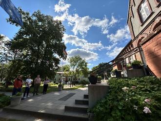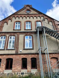 Ruhig ist es heute auf dem Hof der Camminer Storchenschule. Keine spielenden Kinder, die über den Rasen wetzen, zwischen den Büschen Fangen spielen oder unter dem hölzernen Terrassendach ihre Pause genießen. Die Sommerferien sind in vollem Gange und auf dem Schulhof sind Bauarbeiter damit beschäftigt, an der rückseitigen Fassade ein Gerüst zu errichten. Sie wollen am Gesims des denkmalgeschützten Gebäudes arbeiten, denn hier hat der Regen über die Jahrzehnte den Mörtel ausgespült. Feuchtigkeit droht, die alten Ziegel zu zerstören und im schlimmsten Fall ins Mauerwerk zu ziehen.
