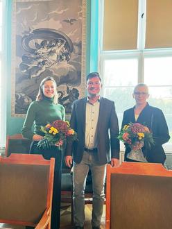 Landrat Sebastian Constien gratuliert Martina Hiltner (l.) und Marie Komm.