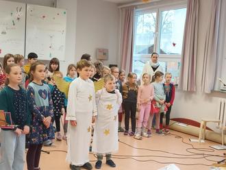 Im Anschluss waren Groß und Klein recht herzlich zur Weihnachtsandacht eingeladen. Der Chor unter der Leitung von Frau Lucht und Frau Tannert gestaltete mit Liedern, Sketchen und Gedichten zur Weihnachtszeit die nächste Stunde. Auch die Weihnachtsgeschichte durfte nicht fehlen. Alle Kinder waren sehr eifrig dabei und gaben ihr Bestes. Das Publikum war begeistert und spendete reichlich Applaus.