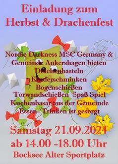 Bocksee - Die Gemeinde Ankershagen lädt herzlich zum Herbst- und Drachenfest ein, das am 21. September 2024 auf dem alten Sportplatz in Bocksee stattfinden wird. Von 14:00 bis 18:00 Uhr erwartet die Besucher ein vielfältiges Programm voller Spaß und Unterhaltung für die ganze Familie.