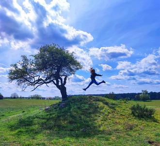 Es muss eine enorme Mühe gekostet haben, im richtigen Moment den Auslöser für dieses Meisterwerk zu drücken. Den Sprung der jungen Frau in der Bildmitte so für die Ewigkeit einzufangen verdient höchste Wertschätzung und erinnert uns alle daran, dass innere Kind gleich jeden Alters ab und an mal „rauszulassen“ und einen freudigen Luftsprung erfüllt von kindlichem Übermut zu wagen. Ein Moment der Schwerelosigkeit verankert in strahlendem Himmelblau und sattem Grün.