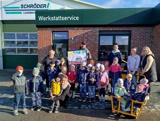Aus diesem Grund wollen der Elternrat, wir Erzieher und vor allem die Kinder ein persönliches Dankeschön überbringen. Da der von der Kita bis zu Schröder Landtechnik ein großer Spaziergang war, nahmen nur die ganz Kleinen im Wagen und die größeren Kinder teil. Alle Kinder gestalteten zusammen ein gemeinschaftliches Bild mit Finger-Handabdrücken und Malereien.