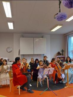 Frühstück verschiedene Türen, die in Epochen führten: Der Kunstraum verwandelte sich in eine Höhlenmalerei. Dabei wurde mit Naturmaterialien gemalt. Ein Klassenzimmer führte in das alte Ägypten. Anne Beckmann, die sich sehr für die Ägyptologie interessiert, führte eigenständig den Workshop mit ihren Klassenkameraden durch. Alte Papyrusrollen wurden begutachtet und Mumien gegipst. Barocke Klänge drangen aus dem Musikraum. Die Workshopteilnehmer gründeten ein barockes Schulorchester und musizierten gemeinsam. Anschließend wurde der passende Tanz zu Johann Sebastian Bachs Menuett in G Dur einstudiert- natürlich in passenden Gewändern. Alle hatten viel Freude und hätten fast vor Begeisterung die feierliche Übergabe der Lernberichte verpasst.