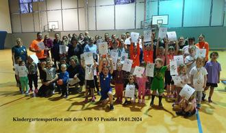 Der VfB 93 Penzlin veranstaltete am 19.01.2024 zusammen mit dem evangelischen Kindergarten „Simon unterm Regenbogen“ ein Sportfest in der Turnhalle im Bürgerzentrum Penzlin. Dem Aufruf folgten 44 Kinder mit Eltern, Großeltern und Onkel und Tanten, zusammen über 100 Personen. Der VfB war mit 5 Übungsleitern und 10 Mädchen der weiblichen Jugend D vor Ort. Insgesamt waren in der Turnhalle 10 Stationen aufgebaut, die absolviert werden sollten. Dabei war die Reihenfolge und wie oft eine Station absolviert wurde egal, aber einmal musste man jede Station bestreiten. An jeder Station musste dann auf dem Teilnehmerzettel ein bestimmter Teil farblich ausgemalt werden. Am Schluss der Veranstaltung war dann der ausgefüllte Zettel der Nachweis für den Erhalt der Urkunde und der Goldmedaille für die erfolgreiche Teilnahme am Kindergarten Sportfest des VfB 93 Penzlin. Den Anfang machte aber Jacqueline Haase mit der Erwärmung zum Schüttelsong. Dann haben sich die Kinder und teilweise auch Eltern an den Sportgeräten ausprobiert. Der Verein bedankt sich bei allen Teilnehmern und Unterstützern für die erfolgreiche Durchführung des Sportfestes.