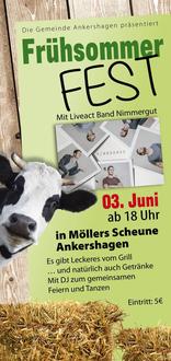 Die Gemeinde Ankershagen lädt am 3. Juni 2023 ab 18 Uhr zum Frühsommerfest in Möllers Scheune ein. Die Besucher erwartet ein Abend voller guter Musik, Essen vom Grill und einer Tanzparty mit DJ.
