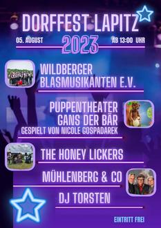 Und nun dauert es gar nicht mehr lang, dann laden die Lapitzer am 05. August ab 13:00 Uhr zum Dorffest vor dem Gutshaus. Diesmal werden Musikfans voll und ganz auf ihre Kosten kommen. Das Publikum erwartet auf dem Fest: „Die Honey Lickers“, „Die Wildberger Blasmusikanten“, „Die Band Mühlenberg & Co.“ und „DJ Torsten“. Ebenfalls freuen können sich die Gäste auf eine Tombola, das alljährlich beliebte Küchenbuffet, sowie Essen und Getränke am Abend. Für die Kleinen wartet am Nachmittag unter anderem ein Puppentheater, der beliebte Spielplatz und eine Hüpfburg.