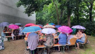 Nach der Ansprache von Hartmut Kindermann, über die anstehenden Aktivitäten des Kulturvereins und der Seniorengruppe, waren alle bestens informiert und zeitgleich wurden auch schon die ersten Grillwürstchen seviert. Mit Gegrilltem wie auch mit Getränken wurden alle reichlich versorgt. Trotz des dann eisetzenden Regens und dank der greichten Regenschirme war die Stimmung ungebroche sehr gut. Alle Teilnehmer hatten viel Spaß und Freude an den anregenden Gesprächen über die kulturellen Ereignisse, wie auch in privaten Gesprächen.