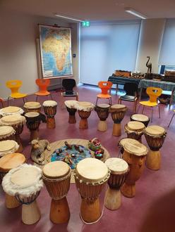 Mit den afrikanischen Trommeln (Djembe) haben wir unterschiedliche Rhythmen eingeübt.
