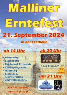 Die Landwirtschaft ist wichtig, sie ernährt uns alle. Doch gerade in diesem Jahr haben wir alle gemerkt, wie viele Steine die Bauern in den Weg gelegt bekommen. Als Bauer durchzuhalten und immer wieder einen Weg zu finden, ist bestimmt nicht einfach. Umso mehr freuen wir uns, Sie wieder recht herzlich zum Malliner Erntefest am 21.09.2024 einzuladen.