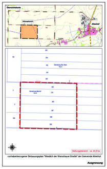 Die Gemeindevertretung der Gemeinde Altenhof hat am 03.12.2021 in öffentlicher Sitzung die Aufstellung eines vorhabenbezogenen Bebauungsplanes „Westlich Warschauer Straße“ gemäß § 12 Baugesetzbuch (BauGB) beschlossen. Der Geltungsbereich des vorhabenbezogenen Bebauungsplanes (insgesamt ca. 44 ha) ist im beiliegenden Übersichtsplan durch eine gestrichelte Linie umgrenzt und befindet sich westlich der Ortschaft Altenhof und der Warschauer Straße.
