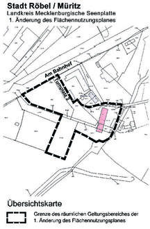 Der räumliche Geltungsbereich der 1. Änderung des Flächennutzungsplanes der Stadt Röbel/Müritz ist in der anliegenden Übersichtskarte mit einer gestrichelten Linie umgrenzt. Das Plangebiet ist gelegen südöstlich angrenzend an der Kreuzung Plauer Chaussee - Landesstraße L 24 Richtung Bollewick - Am Bahnhof und beinhaltet eine Fläche von etwa 1,4 ha mit den Flurstücken 401/10, 401/12, 401/13, 401/14, 402/6, 402/7, 402/8, 404/9, 404/17, 404/26, 419/14, 419/23 der Flur 14, Gemarkung Röbel.