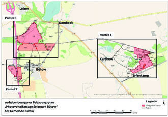 Die Gemeindevertretung der Gemeinde Bütow hat am 24.03.2022 in öffentlicher Sitzung die Aufstellung eines vorhabenbezogenen Bebauungsplanes „Solarpark Bütow“ gemäß § 12 Baugesetzbuch (BauGB) beschlossen. Der Geltungsbereich des vorhabenbezogenen Bebauungsplanes umfasst drei Teilgeltungsbereiche (insgesamt ca. 114 ha), die im beiliegenden Übersichtsplan durch eine gestrichelte Linie umgrenzt sind.