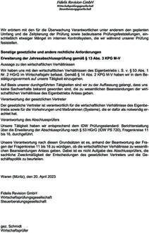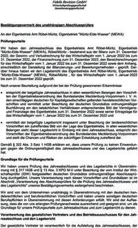 | 1. | Der Jahresabschluss zum 31. Dezember 2022 des Amtes Röbel-Müritz, Eigenbetrieb „Müritz-Elde-Wasser“ wurde durch die Wirtschaftsprüfungsgesellschaft und Steuerberatungsgesellschaft Fidelis Revision GmbH am 20. April 2023 mit folgendem Bestätigungsvermerk versehen: |