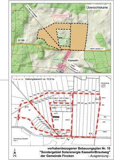 Die Gemeindevertretung der Gemeinde Fincken hat in öffentlicher Sitzung am 08.10.2024 den Entwurf des vorhabenbezogenen Bebauungsplanes Nr. 10 „Sondergebiet Solarenergie Kaeselin/Brautweg“ (Stand 11.09.2024) gebilligt und die Durchführung der Öffentlichkeitsbeteiligung gemäß § 3 Abs. 2 Baugesetzbuch (BauGB) beschlossen (Geltungsbereich siehe Übersichtsplan).