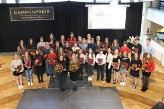 Für das kulturelle Rahmenprogramm sorgten bei der diesjährigen Preisverleihung die beiden Chöre des Schulcampus sowie vielfältige Solistenauftritte. So kündigte z.B. ein Trompetensolo den Höhepunkt des Abends an: die Verleihung des Campuspreises 2023. Für die höchste Auszeichnung der Schule muss man nicht nur hervorragende Noten vorweisen, sondern sich ebenso sozial engagieren. In diesem Jahr ist es sogar zwei Schülerinnen gelungen, den Preis in Form eines Pokals mit nach Hause zu nehmen: