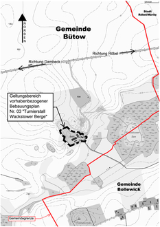 Der Geltungsbereich der Satzung über den vorhabenbezogenen Bebauungsplan Nr. 03 „Turnierstall Wackstower Berge“ der Gemeinde Bütow ist im beiliegenden Übersichtsplan dargestellt und durch eine gestrichelte Linie umgrenzt. Die Erteilung der Genehmigung wird hiermit bekannt gemacht.