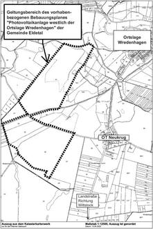 Der geänderte Entwurf des vorhabenbezogenen Bebauungsplanes Nr. 07 „Photovoltaikanlage westlich der Ortslage Wredenhagen“ der Gemeinde Eldetal (Geltungsbereich siehe Übersichtsplan), der Vorhaben- und Erschließungsplan, sowie der geänderte Entwurf der Begründung einschließlich Umweltbericht, Artenschutzrechtlicher Fachbeitrag, Blendgutachten sowie den nach Einschätzung der Gemeinde wesentlichen, vorliegenden umweltbezogenen Stellungnahmen sind vom