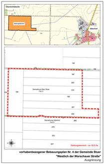 Die Gemeindevertretung der Gemeinde Stuer hat am 08.05.2025 in öffentlicher Sitzung den geänderten Entwurf des vorhabenbezogenen Bebauungsplanes Nr. 04 „Westlich der Warschauer Straße“ (Stand April 2025) der Gemeinde Stuer gebilligt und die erneute Durchführung der Öffentlichkeitsbeteiligung gem. § 3 Abs. 2 BauGB und der Behördenbeteiligung gem. § 4 Abs. 2 BauGB beschlossen. Gemäß § 4a Abs. 3 BauGB wird die Dauer der öffentlichen Auslegung verkürzt. Gemäß § 4a Abs. 3 Satz 2 BauGB wird darauf hingewiesen, dass Stellungnahmen nur zu folgenden geänderten oder ergänzten Teilen des Entwurfs abgegeben werden können: