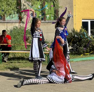 Danach wurde symbolisch die Schleife am Eingang des neuen Klassenzimmers im Grünen geöffnet. Mit Vorfreude strömten die Kinder gleich hinein und genossen ein Eis im schattigen und luftigen Plätzchen. Nach der offiziellen Eröffnung erwartete die Familien auf dem Schulhof noch ein buntes Programm, welches durch die Showtanzgruppe Lexow schwungvoll begann.
