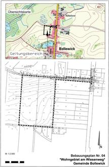 Der Geltungsbereich der Satzung über den Bebauungsplan Nr. 04 „Wohngebiet am Wiesenweg“ der Gemeinde Bollewick ist im beiliegenden Übersichtsplan dargestellt und durch eine gestrichelte Linie umgrenzt.