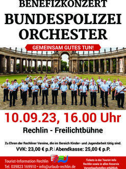 Am Sonntag, den 10. September, findet um 16.00 Uhr ein spätsommerliches Benefizkonzert des renommierten Berliner Bundespolizeiorchesters in Zusammenarbeit der Gemeinde Rechlin statt. Mit seinen professionellen Darbietungen ist das Orchester ein wichtiger Repräsentant der Bundespolizei und damit ein bedeutender Bestandteil der bundespolizeilichen Öffentlichkeitsarbeit. Das Bundespolizeiorchester Berlin verfügt über ein umfangreiches Repertoire. Dazu gehören Originalkompositionen für symphonisches Blasorchester, Spezialarrangements aus den Bereichen Unterhaltungs- und Filmmusik und Musical sowie traditionelle Märsche. Das Konzert auf der Freilichtbühne in Rechlin findet unter der Leitung seines Chefdirigenten Gerd Herklotz statt.