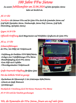 Der nächste Höhepunkt in unserer Gemeinde ist das Jubiläum unserer Freiwilligen Feuerwehr, sie feiert in diesem Jahr ihren 100. Geburtstag.
