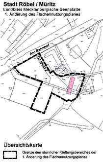 Der räumliche Geltungsbereich der 1. Änderung des Flächennutzngsplanes ist in der anliegenden Übersichtskarte mit einer gestrichelten Linie umgrenzt. Das Plangebiet ist gelegen südöstlich angrenzend an der Kreuzung Plauer Chaussee - Landesstraße L 24 Richtung Bollewick - Am Bahnhof und beinhaltet eine Fläche von etwa 1,43 ha mit den Flurstücken 401/10, 401/12, 401/13, 401/14, 402/6, 402/7, 402/8, 404/9, 404/17, 404/26, 419/14, 419/23 der Flur 14, Gemarkung Röbel.