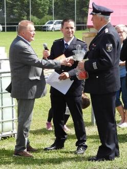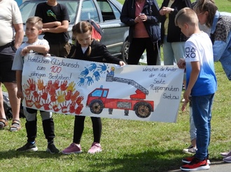 Unser Wehrführer Christian Priestaff und ich durften alle Anwesenden begrüßen und ein Fazit aus 100 Jahren Feuerwehr Sietow ziehen. In diesem Zusammenhang wurde unser Ehrenwehrführer Brandmeister Manfred Henkel für seine langjährige aktive Arbeit in der Sietower Feuerwehr geehrt - er erhielt als erster die von Wilhelm Erichson erarbeitete Chronik „100 Jahre Feuerwehr Sietow“ überreicht. Diese Chronik wurde auch den anwesenden Feuerwehren des Amtsbereiches als Präsent übergeben. Eine Überraschung für die Sietower Feuerwehr war der Auftritt einer kleinen Delegation der Sietower KITA, welche eine große gebastelte Grußadresse als Dankeschön an die Kameradinnen und Kameraden überreichten.
