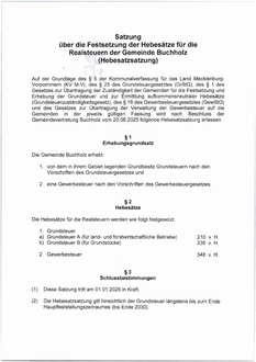 Auf der Grundlage des § 5 der Kommunalverfassung für das Land Mecklenburg-Vorpommern (KV M-V), des § 25 des Grundsteuergesetztes (GrStG), des § 1 des Gesetzes zur Übertragung der Zuständigkeit der Gemeinden für die Festsetzung und Erhebung der Grundsteuer und zur Ermittlung aufkommensneutraler Hebesätze (Grundsteuerzuständigkeitsgesetz), des § 16 des Gewerbesteuergesetztes (GewStG) und des Gesetzes zur Übertragung der Verwaltung der Gewerbesteuer auf die Gemeinden in der jeweils gültigen Fassung wird nach Beschluss der Gemeindevertretung Buchholz vom 20.06.2025 folgende Hebesatzsatzung erlassen.