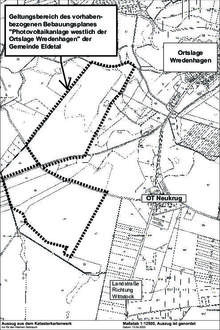 Die Gemeindevertretung der Gemeinde Eldetal hat am 11.11.2021 in öffentlicher Sitzung aufgrund von § 12 Baugesetzbuch die Aufstellung des vorhabenbezogenen Bebauungsplanes Nr. 07 „Photovoltaikanlage westlich der Ortslage Wredenhagen“ beschlossen. Mit Beschluss vom 20.04.2023 wurde eine Änderung des Geltungsbereiches beschlossen.