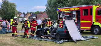 Es wurde ein Fettbrand nachgestellt, der jeden auf die Folgen von Wasserzugabe ausdrucksvoll hingewiesen hat. Unsere Nachbarwehr Fünfseen stellte die Technische Hilfeleistung mit Schere und Spreizer an einem ausgesonderten Fahrzeug dar. In kürzester Zeit wurde aus dem Kleinwagen ein Cabrio gestaltet - am Wochenende nur zur Demonstration, aber im Ernstfall ein wichtiges Element der Rettung durch die Kameraden. Somit konnten wir es sehr leicht schaffen, bei Klein und Groß ein Interesse für die ehrenamtliche Arbeit der Feuerwehr zu wecken.