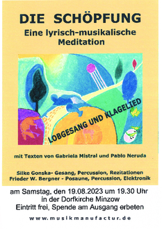 | Sa. | 19.08. | 19:30 | „Die Schöpfung in Zeiten des Klimawandels" - eine lyrisch-musikalische Meditation mit Texten von Gabriela Mistral und Pablo Neruda; Minzow |