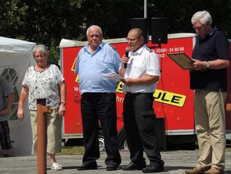 Anschließend wurde von der FFW Krümmel der neue Schlauchanhänger übernommen und der Wehrführer bedanke sich bei allen Spendern und Sponsoren, die dafür gesorgt hatten, dass der Gemeinde kaum Kosten entstanden. Im Laufe des Nachmittags zeigten dann die Feuerwehren ihr Können bei verschiedenen Übungen. Die Krümmeler Feuerwehrleute weihten den Anhänger gleich ein und verlegten eine Schlauchstrecke zur Löschwasserversorgung. Die Mirower Kameraden stellten Waldbrandtechnik vor und zeigten einen Ringsprengler und eine Wasserwand, sowie den Aufbau eines Versorgungsbeckens. Die Grabow-Belower zeigten mit ihrem Tatra das Löschen eines Waldbrandes. Die Lärzer Kameraden löschten eine brennende Rasthütte und die Rechliner zeigten die Bergung aus einem PKW mit Hilfe des Schneidewerkzeuges. Außerdem hatten sie ihr Rettungsboot mitgebracht und luden zu Fahrten auf dem Nebelsee ein. Gekonnt führte der Wehrführer, Herr Thomas Höhlein, durch das Feuerwehrprogramm und erklärte die Details.