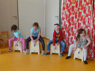 Nach einem gemeinsamen Warm-Up studierte jede Gruppe für ihren Kontinent eine entsprechende instrumentale Aufführung auf einem Cajon ein. Die Blaue Gruppe reiste nach Asien, die Grüne Gruppe musizierte in Europa und die Vorschulkinder trommelten in Amerika.