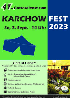 | So. | 03.09. | 14:00 | Karchowfest: Gottesdienst im Zelt auf dem Gelände des Freizeitheims Thema: „Gott ist Liebe?“ (Predigt: Dr. Jonathan Armstrong, Marburg) mit Gospelchor „Gospel Union, Kinderprogramm, Berichte, Gutenbergpresse, Büchertisch, große Kaffeerunde; Karchow |