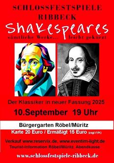 Und auch 2025 wird eine ganz spezielle Version von Shakespeares sämtliche Werke - leicht gekürzt die Zuschauer erfreuen. Nach einem Besuch dieses besonderen Stücks werden die Zuschauer mit Shakespeare-Zitaten nur so glänzen können! Denn mit viel Humor und unglaublichem Tempo führt dieser Abend nicht nur Shakespeare-Kenner, sondern auch neugierig Unwissende durch 37 Stücke Welttheater. Wir versprechen nach diesem „Crash-Kurs in Shakespeare“ eine neue Sichtweise auf einen alten Literaten und werden Vorstellungen mit Lach-Garantie haben! Drei Schauspieler spielen dabei alle 1.834 Rollen, in der Tradition Shakespeares natürlich auch alle Frauen-Rollen. Die drei Männer wagen sich also an das Kunststück, das in der Geschichte des Theaters einzigartig ist. Sie sind gefordert bei dieser durchaus sportlichen Aufgabe, die Kondition und Durchhaltevermögen abverlangt. Darf man mit Klassikern der Literatur Spaß haben?! Man kann, darf und soll! Das Ergebnis ist ein sensationelles Theatererlebnis! Theater macht Spaß und wer Hamlet noch nie im Schnelldurchlauf bzw. im Rückwärtsgang gesehen und gehört hat, der hat etwas verpasst.