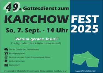 Kinder, Jugendliche und Erwachsene aus ganz Deutschland kommen zu christlichen Freizeiten nach Karchow. Einmal im Jahr wird mit vielen Freunden zusammen gefeiert - das Karchowfest. Es findet in diesem Jahr am 7. September statt, Beginn ist 14 Uhr. In einem Festgottesdienst wollen wir Gott danken, für die Hilfe, die wir im zurückliegenden Jahr erfahren haben. Gäste aus dem In- und Ausland werden über ihre Arbeit berichten. Matthias Köhler, Pfarrer in Nümbrecht/NRW, hält die Predigt. Für die Kinder gibt es ein Extra-Kinderprogramm. Außerdem steht ein großer Büchertisch bereit und am Ende folgt die große Kaffeetafel. Herzliche Einladung an alle, gerne mal nach Karchow zu kommen! - Veranstalter ist die Christliche Freizeit- und Bildungsstätte Karchow e.V. (www.cfb-karchow.de).